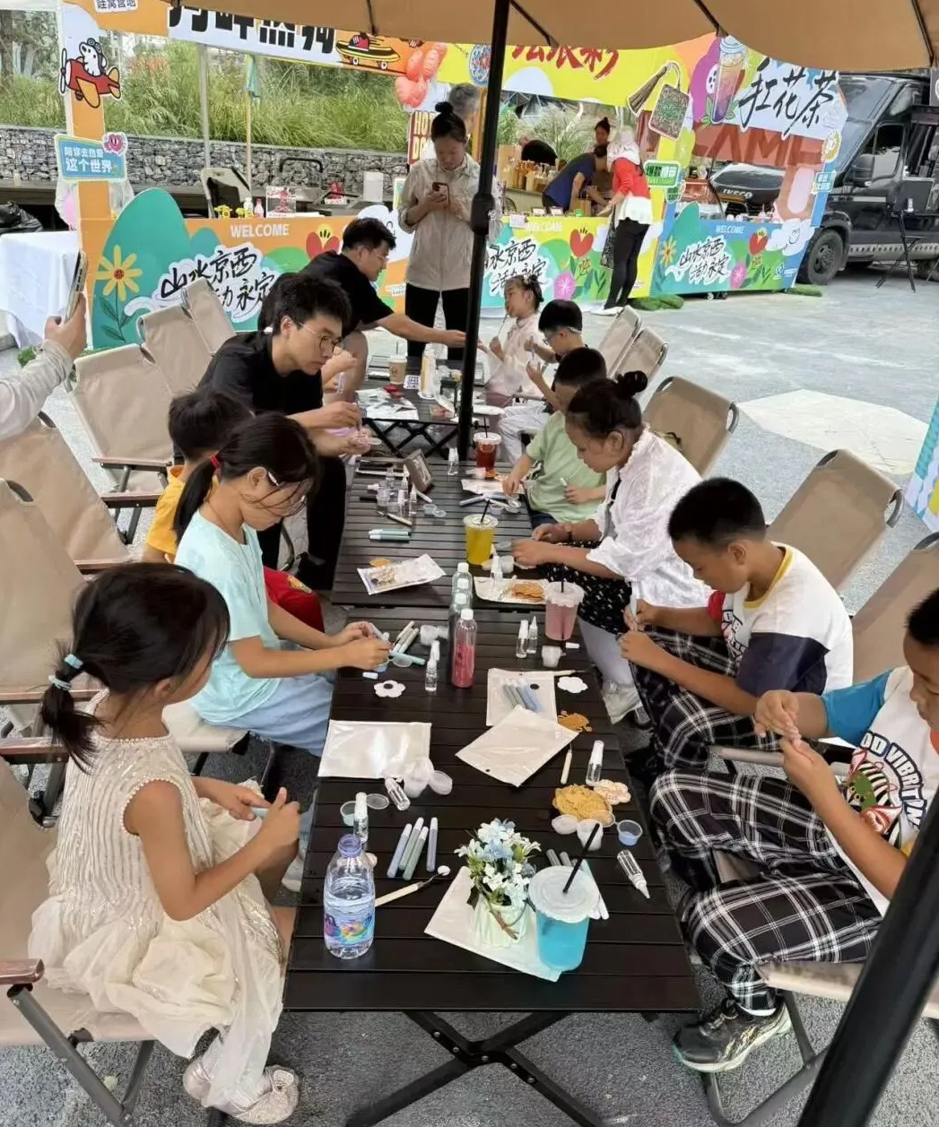 “河畔营地”餐车市集与摄影展遥相呼应,同样是一片热闹景象。孩子们围坐在餐桌前,体验掐丝珐琅非遗手作,跟着老师的讲解一步步操作。先将金丝弯出山水轮廓,再蘸取珐琅釉料上色,指尖与珐琅的碰撞间,原本零散的材料渐渐有了模样,家长们不时拍下孩子认真的模样,偶尔互相交流技巧,欢声笑语在体验区久久回荡。当一个个独一无二的“山水京西”冰箱贴完成时,孩子们举着自己的作品,兴奋地向家长展示,眼里闪烁着成就感的光芒。
